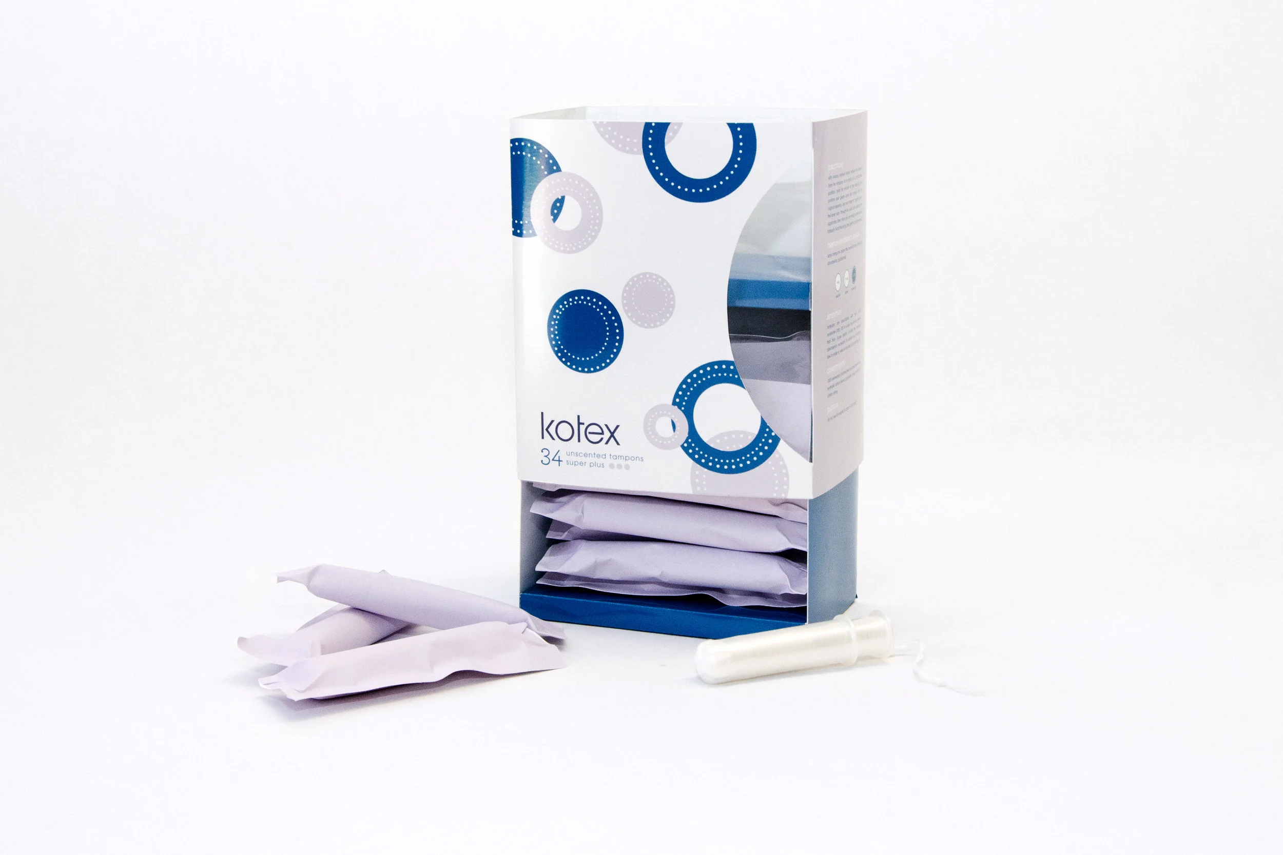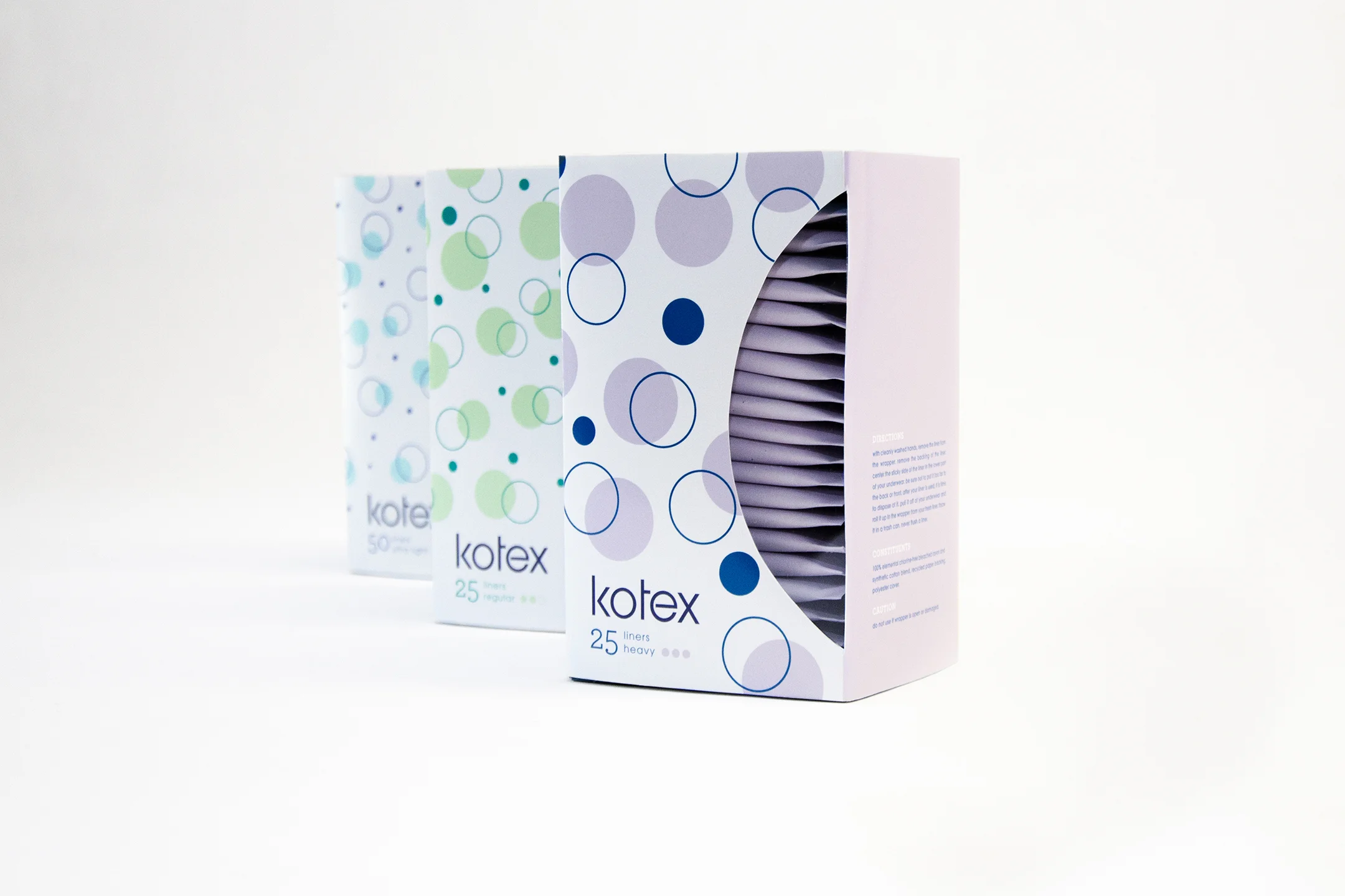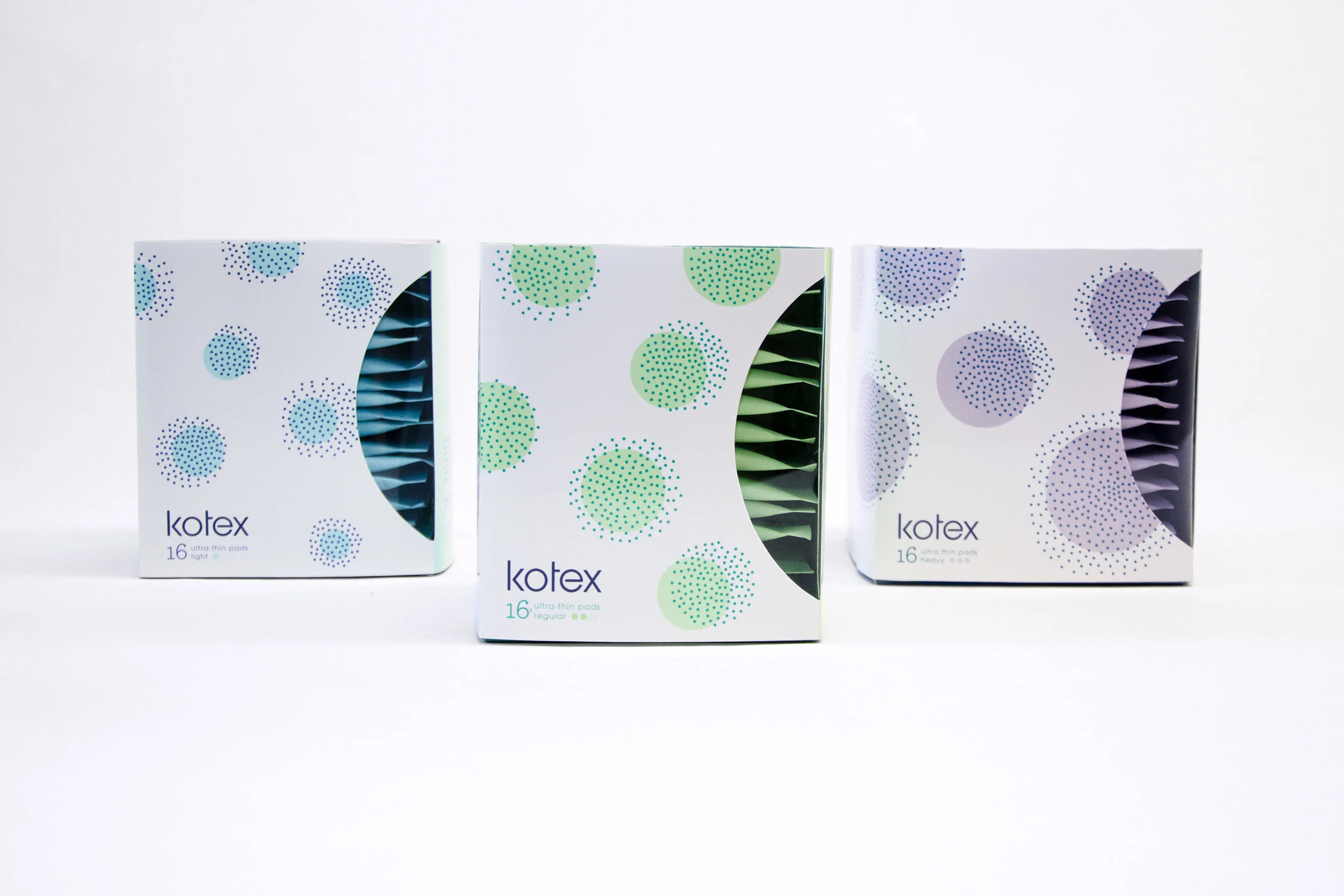 Kotex is a brand of feminine hygiene products. The concept behind the packaging was to create an easier, more sophisticated, way to access feminine products. The variety of patterns and color schemes is used to represent different absorbencies helping women select exactly what they need.