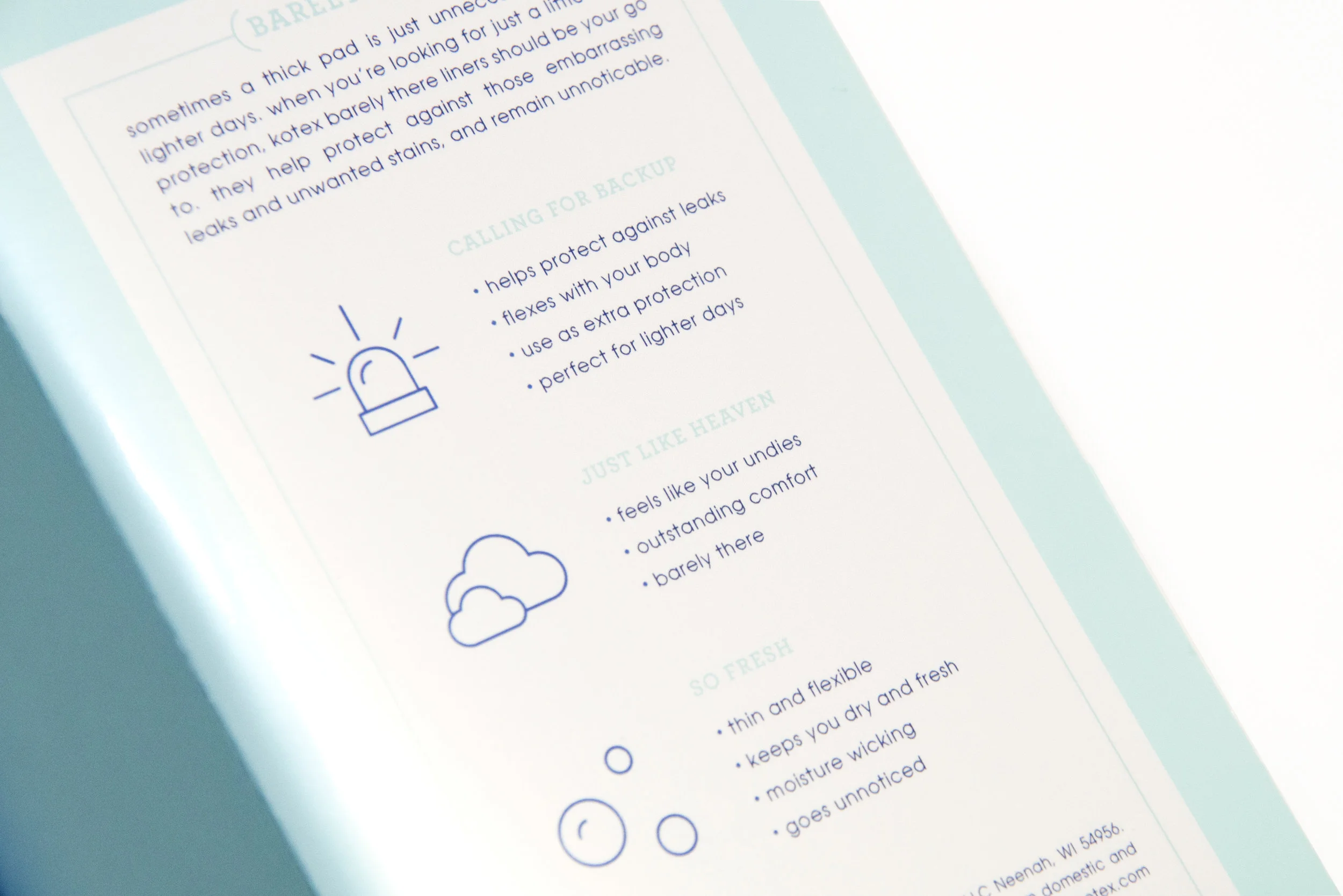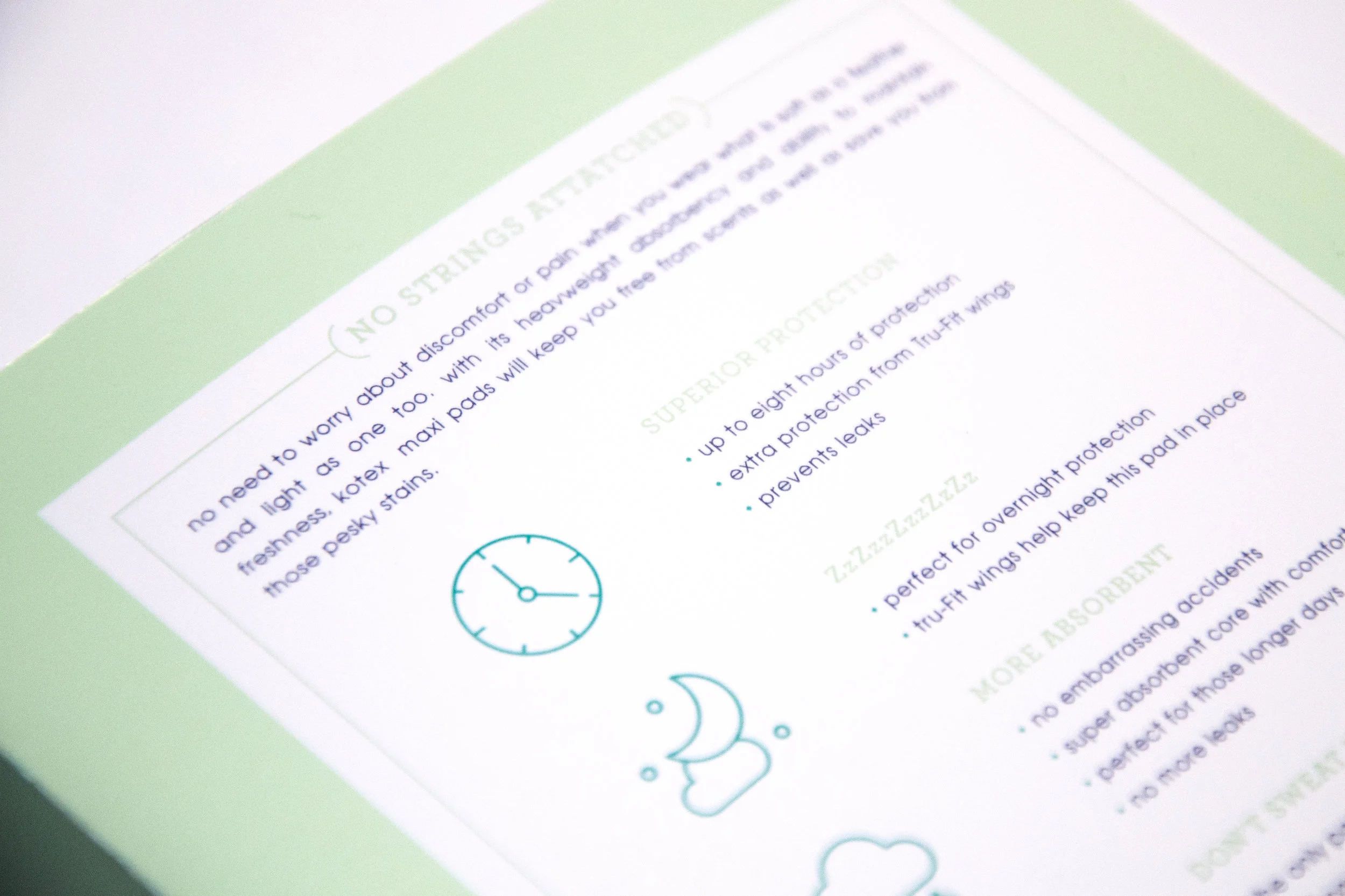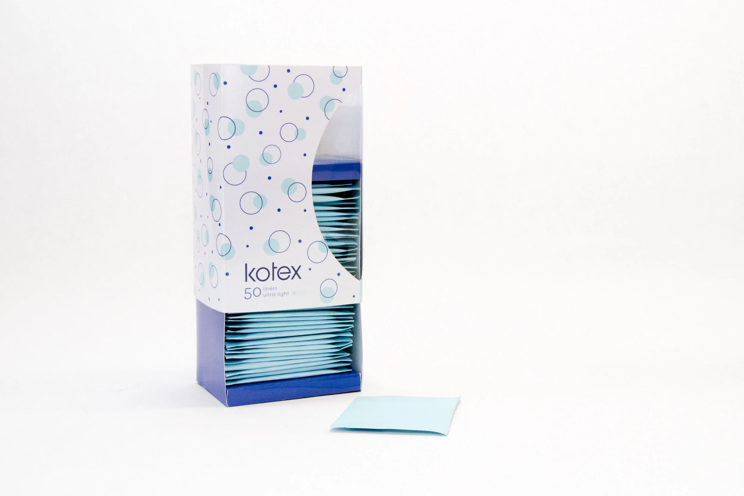 Kotex is a brand of feminine hygiene products. The concept behind the packaging was to create an easier, more sophisticated, way to access feminine products. The variety of patterns and color schemes is used to represent different absorbencies helping women select exactly what they need.